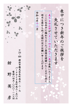 銀の箔押し加工を施した、きらびやかで高級感のある喪中はがきです。